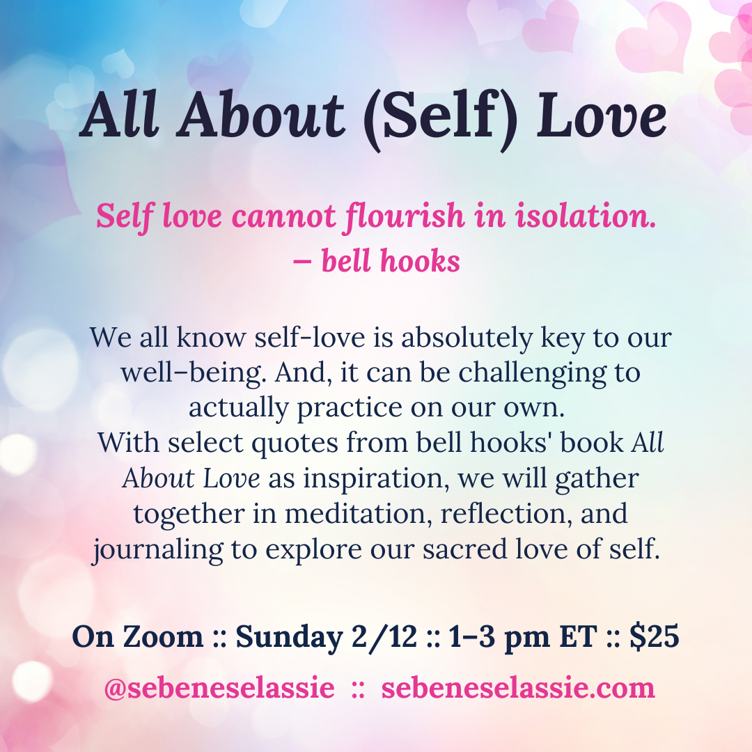 With select quotes from bell hooks' book "All About Love" as inspiration, we will gather together in meditation, reflection, and journaling in order to explore our sacred love of self.