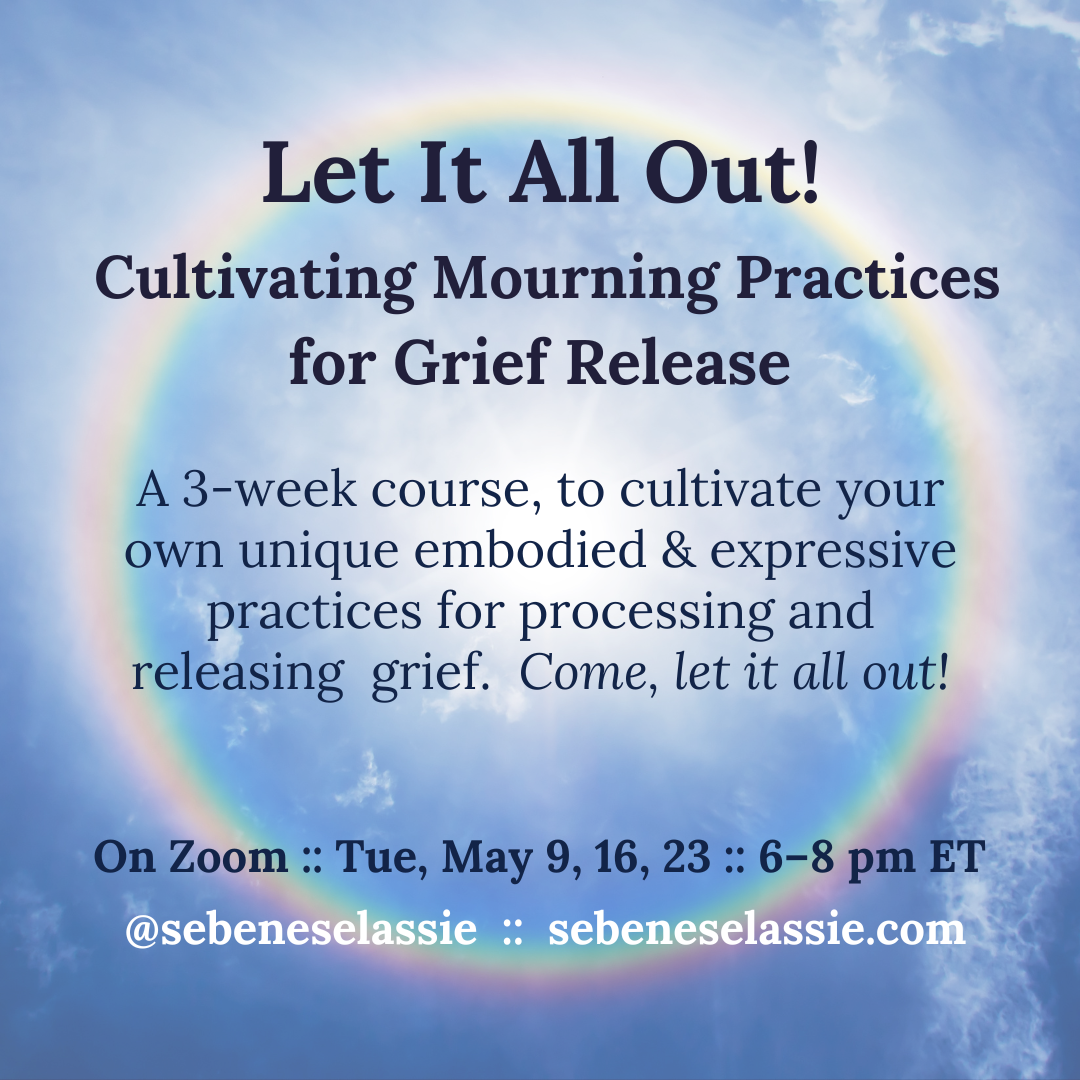 Mourning is inherently embodied — energetically shifting and transmuting the energies of loss & sorrow into gratitude & grace. Mourning rituals are creative and collective and celebratory. They include wailing, song, dance, prayer, the elements, nature, community (and more wailing).