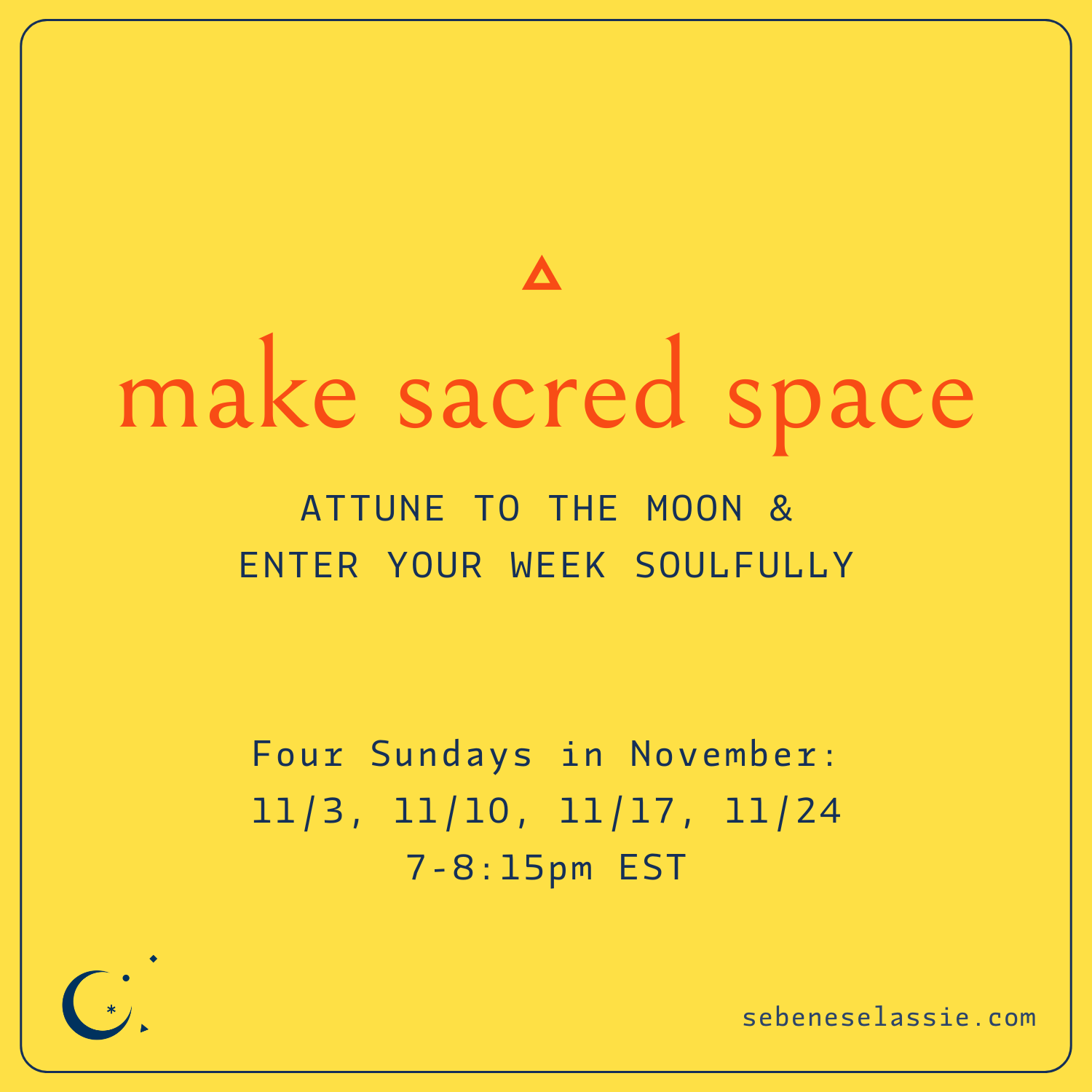 Make Sacred Space is a Sunday eveninf co-creative gathering where we attune to the Moon through guided meditation, journaling prompts, and open space — all for a soulful start to the week.