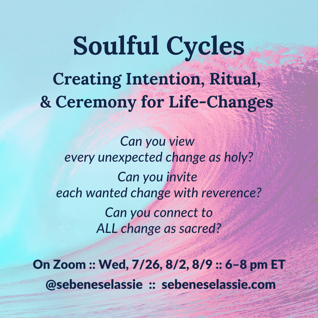 intention. We will spend the first week investigating the power of intention, identifying the specific change we'd like to address and crafting our unique intentions for a sacred relationship to this change. Whether unbidden or called-in, we will engage this change soulfully, with care, reverence, and faith.